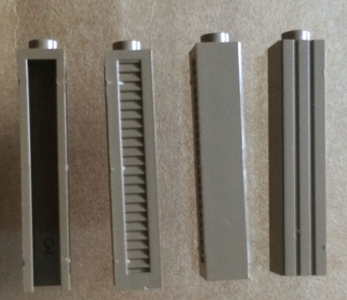 Here are the three types of 2 x 4 bricks, the top is the oldest, with “Pat Pend” inside, and “LEGO” on the stud. The second has the “Pat Pend” scratched out, but still has “LEGO” on the stud. The final brick is a new mold and has “M” on the stud, with no mark about the patent on the inside.